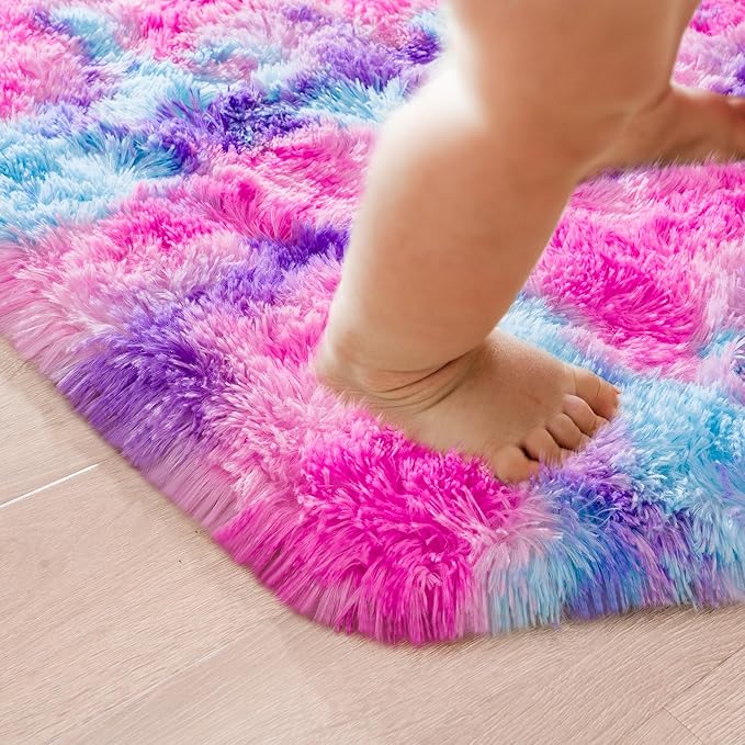 About This Lovely Rainbow Design: Our plush bedroom rug uses the latest tie-dye process to create a unique rainbow rug....