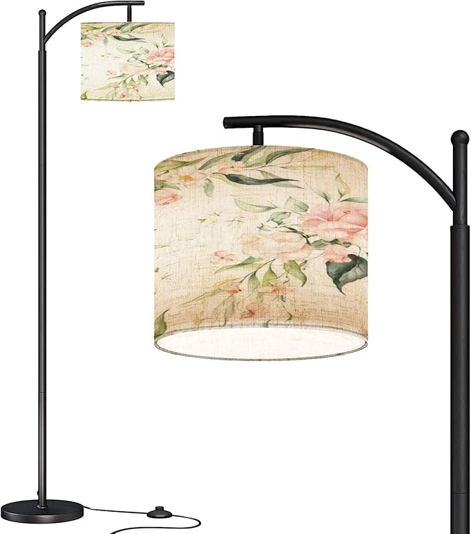 Modern Arc Floor Lamp with Dimmer Mid Century Seamless watercolor floral pink flowers green leaves branches white Metal Standing Lamp with Linen Shade Footswitch for Living Room Bedroom Office