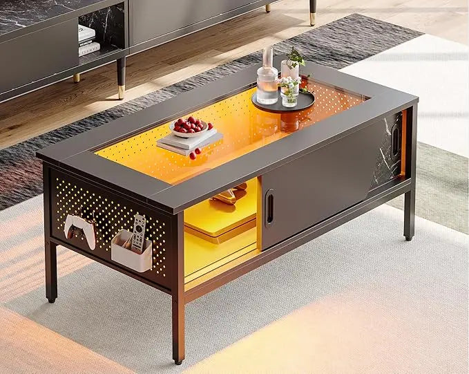Bestier 42 Inch LED Coffee Table with Storage Glass Coffee Tables for Living Room with Sliding Doors, Black Living Room Center Table