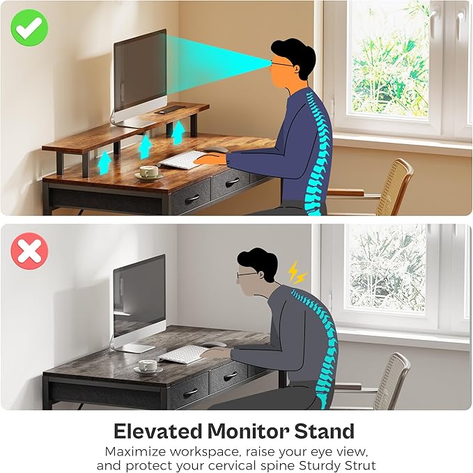 47 inch Computer Desk with 3 Drawers, Office Desk Gaming Desk with LED Lights & Power Outlets, Home Office Desks with Storage Space for Bedroom, Work from Home, Rustic Brown