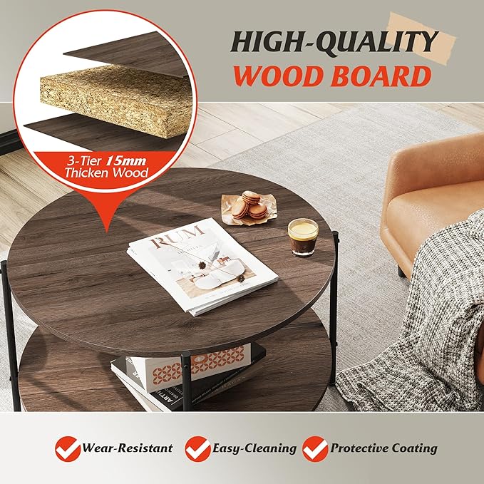 About This 【2-Tier Coffee Table】 WLIVE round coffee table has 2-tier open shelf, and the 32.6" high-strength wooden tabletop can...