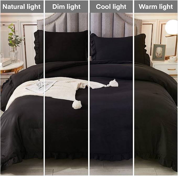 About This 【3 Pieces Black Comforter Set】Available in ruffle comforter california king: 1 ruffled comforter (104x96Inch), 2 pillowcases (20×36Inch); Great...