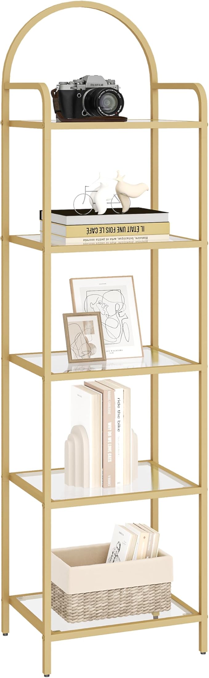 Bookcase Bookshelf, Tempered Glass Bookshelves, Slim Shelving Unit for Bedroom, Bathroom, Home Office, Steel Frame, 5 Tier Gold BC05001G