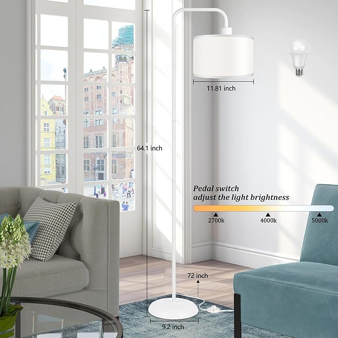 [Upgraded] LED Floor Lamp for Living Room, 3 Color Temperature Floor Lamp with Foot Switch Modern Standing Lamp Tall Pole Floor Reading Lamp for Bedroom, Study Room, Office, 9W Bulb Included, White