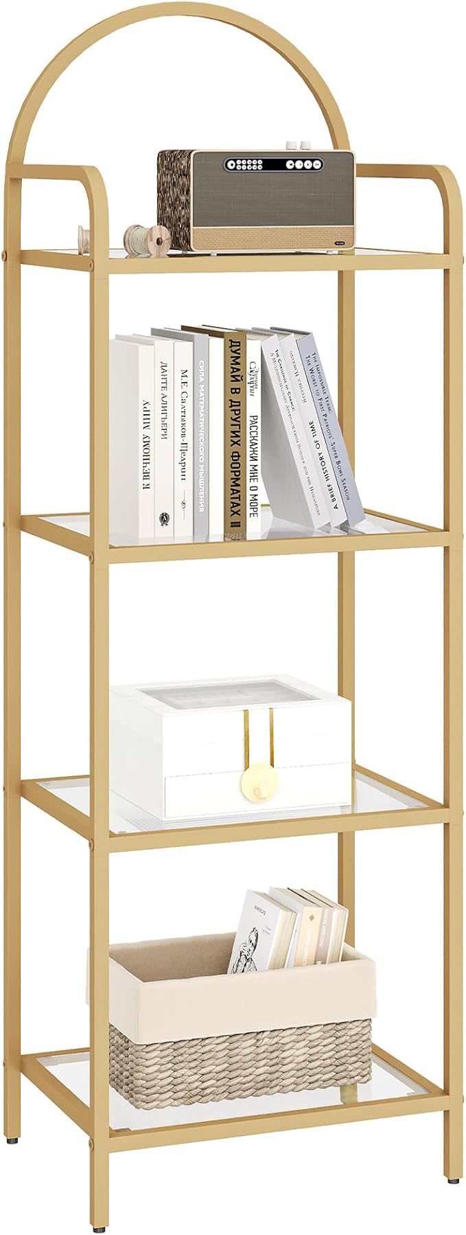 Bookcase Bookshelf, Tempered Glass Bookshelves, Slim Shelving Unit for Bedroom, Bathroom, Home Office, Steel Frame, 4 Tier Gold BC04001G