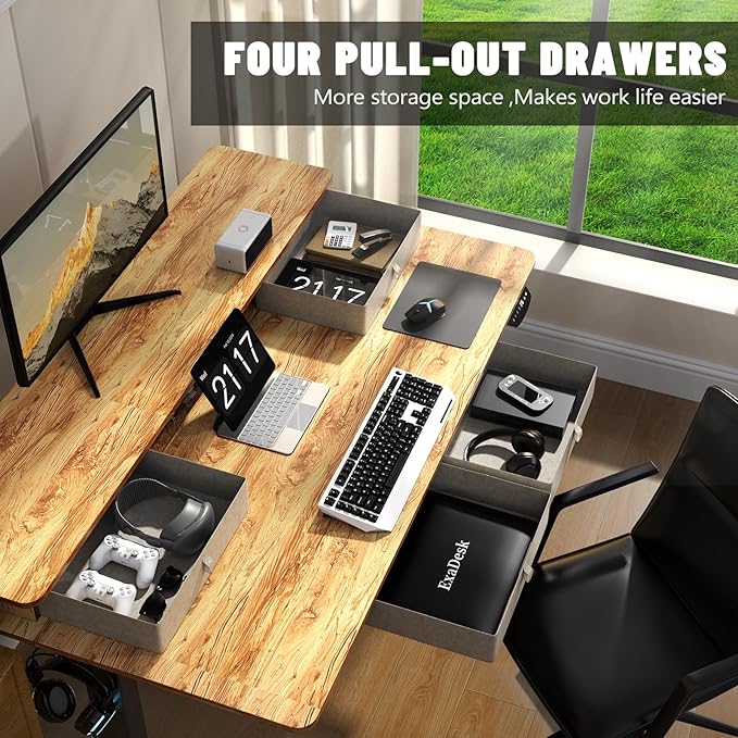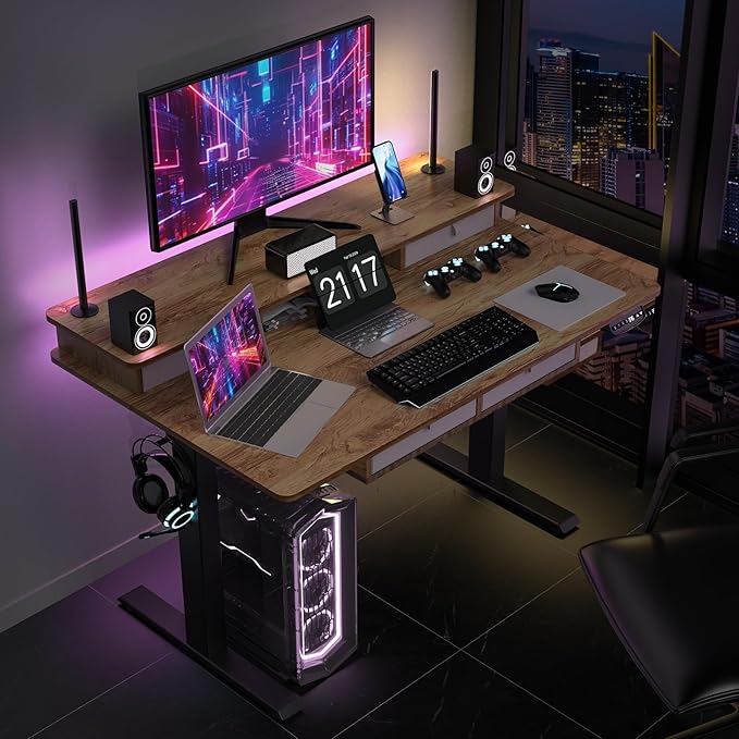 48 * 30 Inches Electric Standing Widened Desk Adjustable Height with 4 Drawers, Double Storage Shelves Stand Up Desk, Home Office Workstation Sit Stand up Desk (Light Rustic Brown)