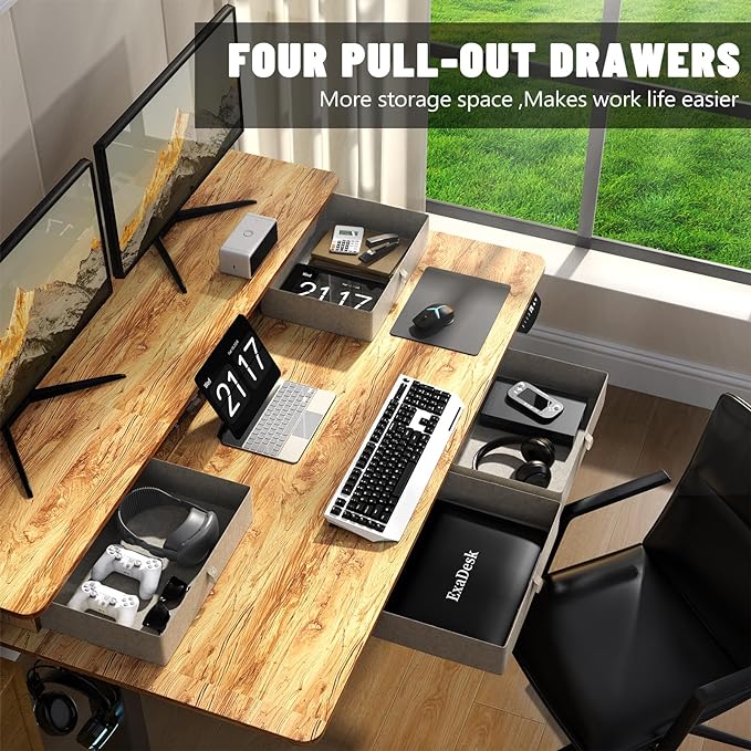55 * 30 Inches Electric Standing Widened Desk Adjustable Height with 4 Drawers, Double Storage Shelves Stand Up Desk, Home Office Workstation Sit Stand up Desk (Light Rustic Brown)