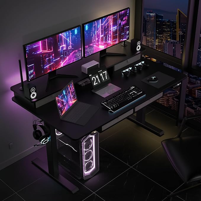 Electric Standing Widened Desk 63 * 30 Inches Adjustable Height with 4 Drawers, Double Storage Shelves Stand Up Desk, Home Office Workstation Sit Stand up Desk (Classical Black)