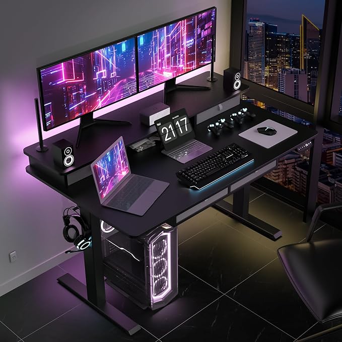 55 * 30 Inches Electric Standing Widened Desk Adjustable Height with 4 Drawers, Double Storage Shelves Stand Up Desk, Home Office Workstation Sit Stand up Desk (Classical Black)