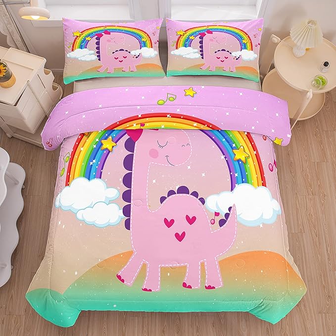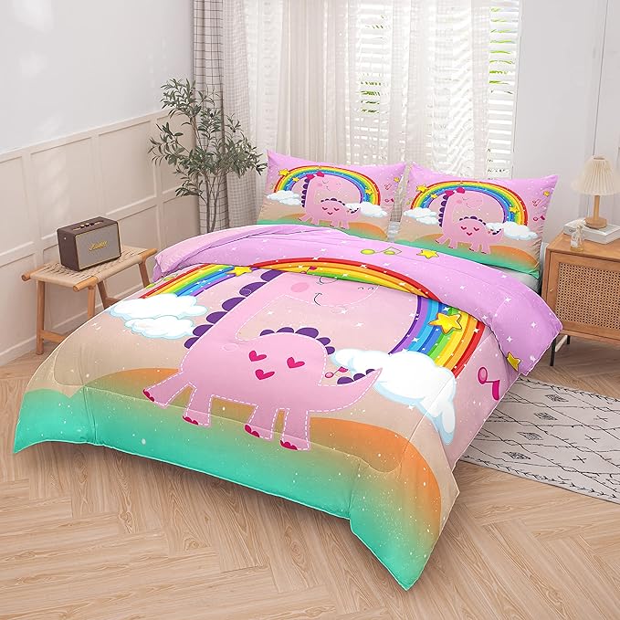 ailor Shop Pink Dinosaur Bedding Set Twin Size,Dinosaur Comforter Set for Girls,Cartoon Rainbow Dino Comforter Sets for Kids Teens,with 1 Comforter 1 Pillowcase…