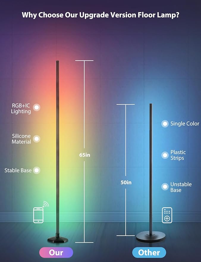 RGB Corner Floor Lamp, 65" Color Changing LED Floor Lamp Bluetooth APP Remote Control Music Sync Modern Standing Lamp 16 Million DIY Colors with Heavy Base for Living Room Bedroom GameRoom