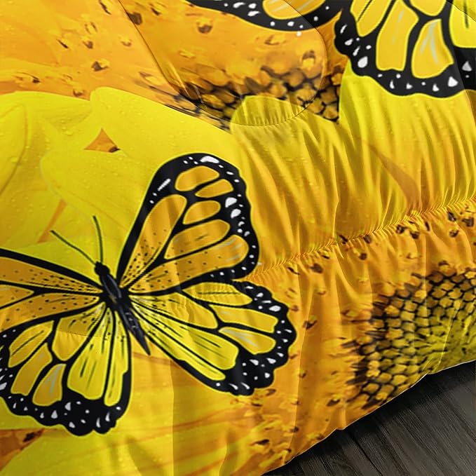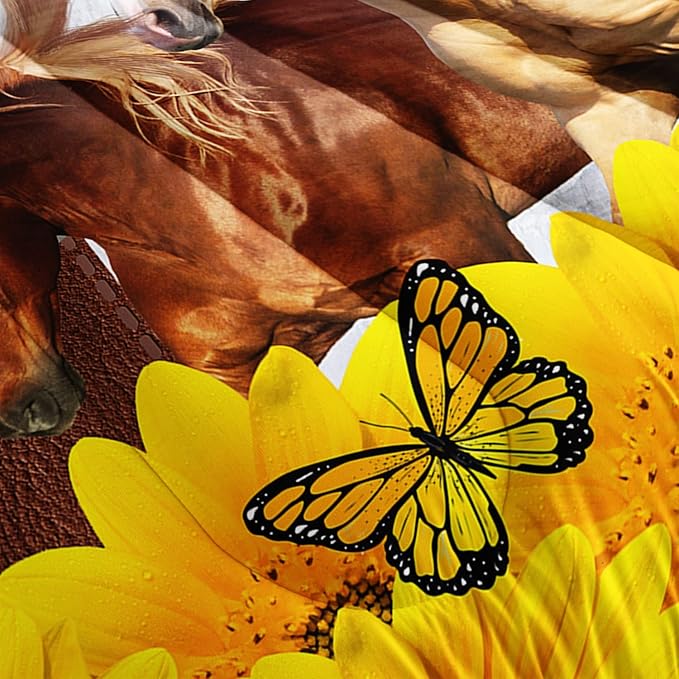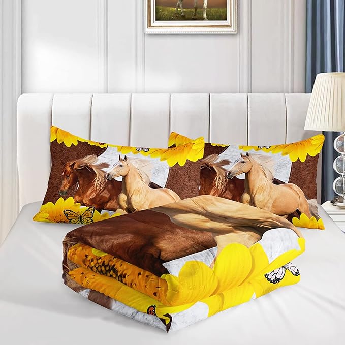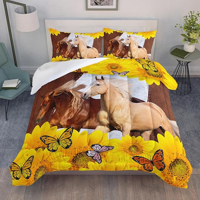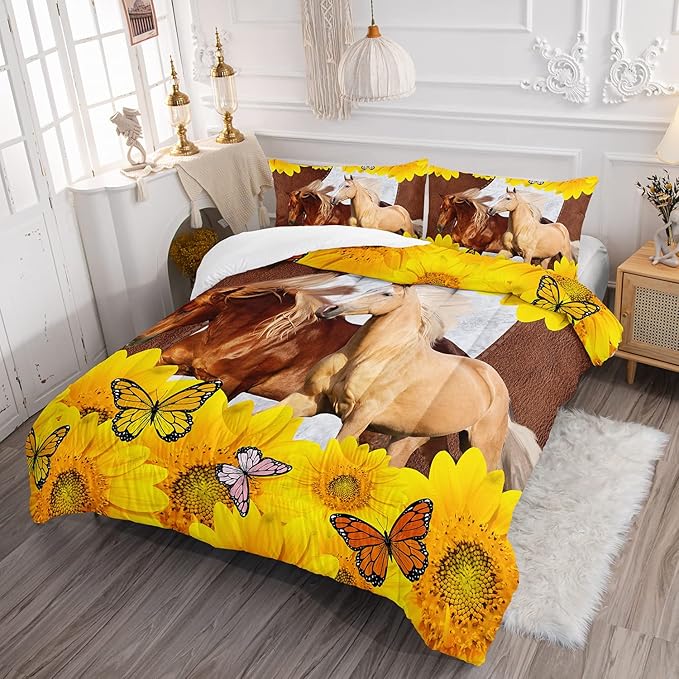 Kid Galloping Horse Comforter Sunflower Butterfly Cowhide Horse Bedding Set for Boys Girls Adult, 1 Comforter + 2 Pillowcases
