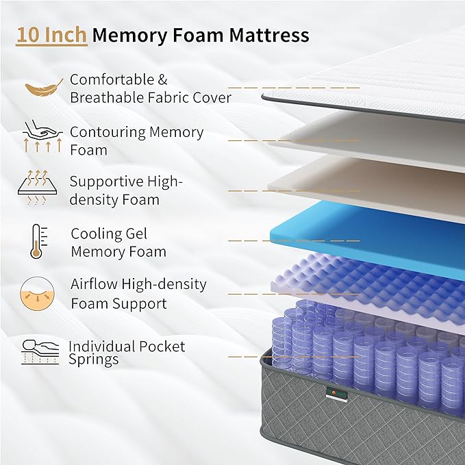 Mattress Queen Size, 10 Inch Memory Foam Firm Queen Mattress Size with Hybrid Queen Bed Mattress in a Box Pressure Relief & Supportive Queen Size Mattress