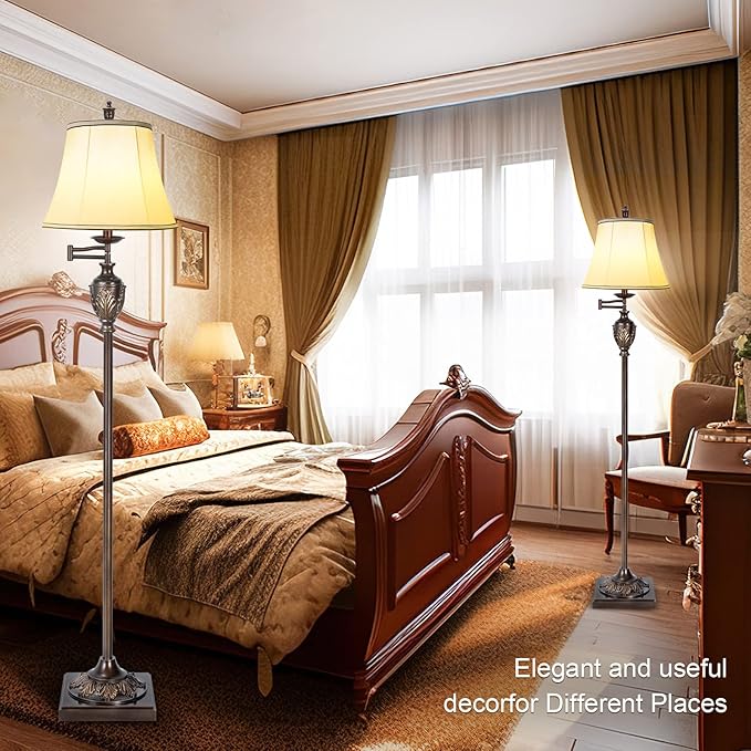 Traditional LED Floor Lamp with 350° Adjustable Swing Arm Lamp – Vintage Standing Pole lamp for Living Room, Bedroom and Office – Rustic Upright Floor Light for Home Décor with Silk Fabric Shade
