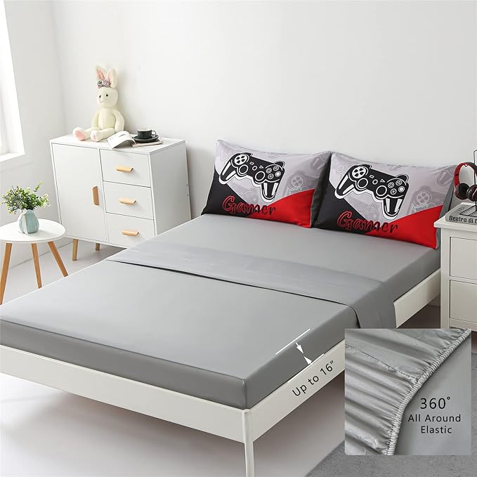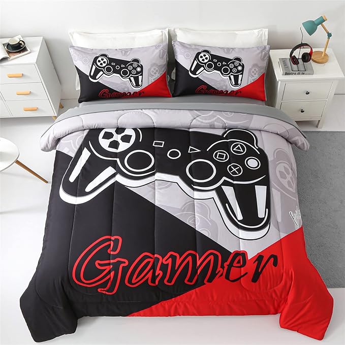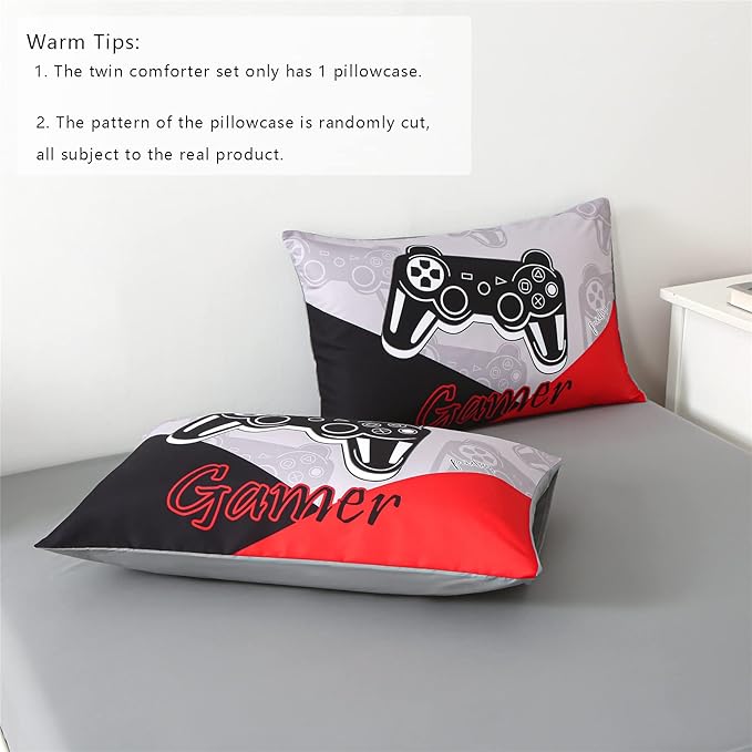About This [Game Controller Design]: 3D video game controller comforter with black grey and red color blocks, making it a...