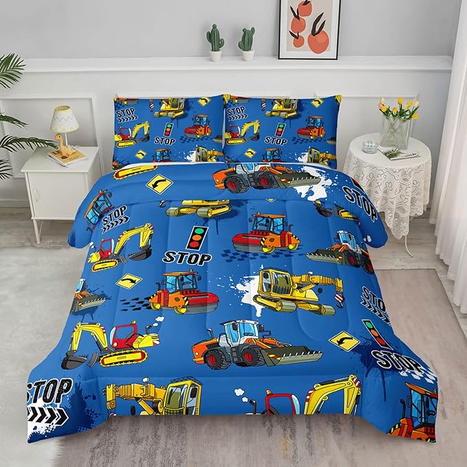 Axolotl Blue Excavator Bedding Full,3Pcs Boys Construction Comforter Set,Cartoon Machinery Truck Bedding Set for Boys Kids Children Teens Bedroom Decor Cars Quilt Set with 1 Comforter 2 Pillowcase