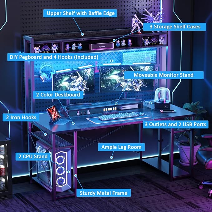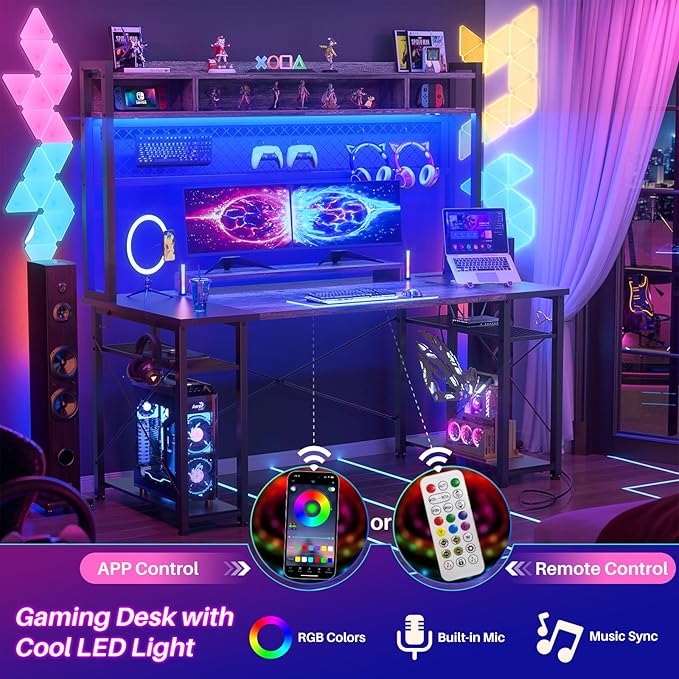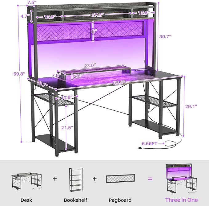 armocity 2024 Upgrade Gaming Desk with Hutch, 55.2'' Magic Computer Desk with LED and Outlets, Reversible Workstation Desk with Pegboard, Grey/Black