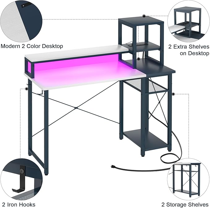 armocity 2024 Upgrade Gaming Desk with LED Lights, Small Computer Desk with Long Monitor Stand, 40'' Reversible Laptop Table with Shelves, Small Desk for Small Spaces, Gaming Room, White and Blue