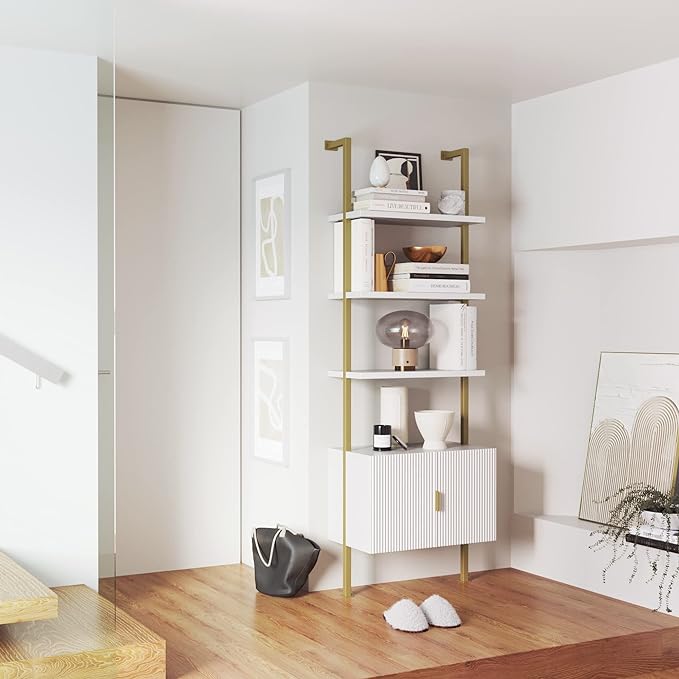 Nathan James Theo Mid-Century Modern Bookcase with Cabinet Fluted Texture, White Open Shelves and Brass Metal Frame Living Room, Home Office Storage