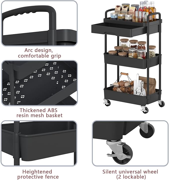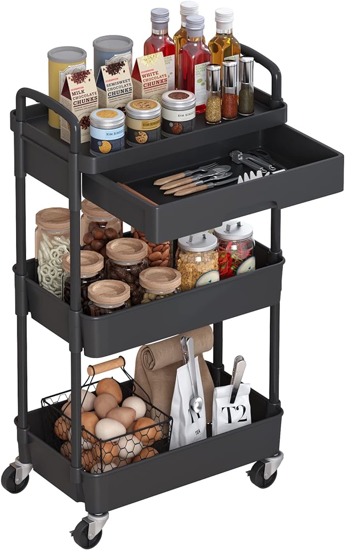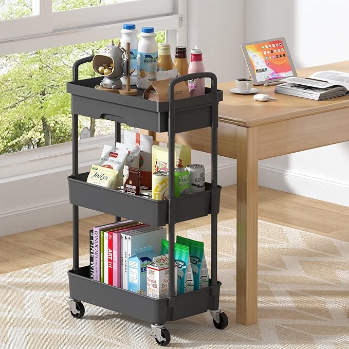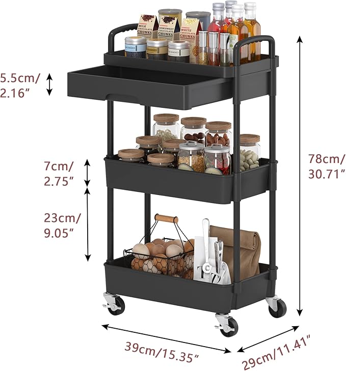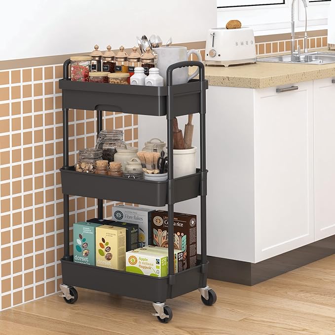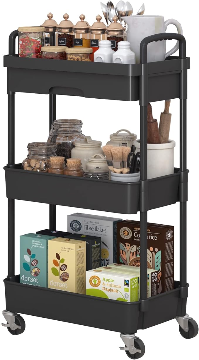 3-Tier Rolling Cart,Trolley with Drawer, Multifunctional Storage Organizer with Plastic Shelf & Metal Wheels, Kitchen Storage Cart for Living Room, Kitchen, Office, Bathroom, Black