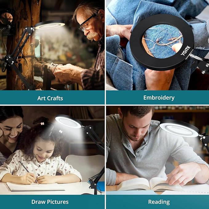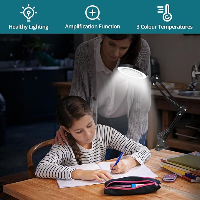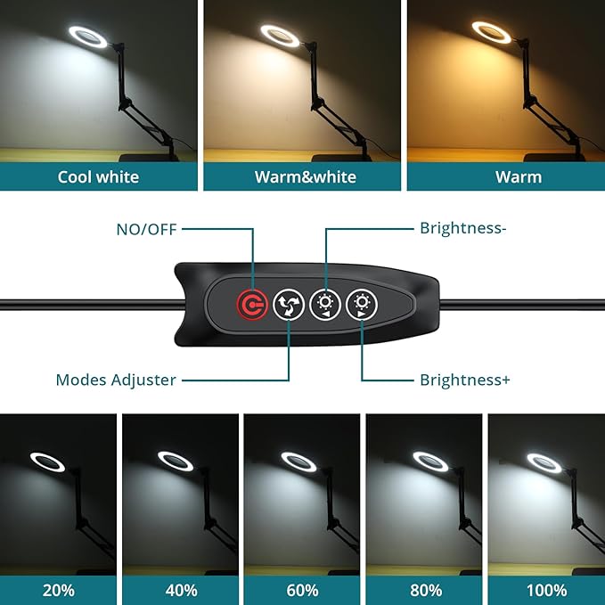 8X Magnifying Glass with Light and Stand, 2-in-1 Lighted Magnifier with Clamp,3 Color Modes Dimmable 10 Brightness Levels LED Desk Magnifying Lamp Hands Free for Crafts Hobby Reading Close Work