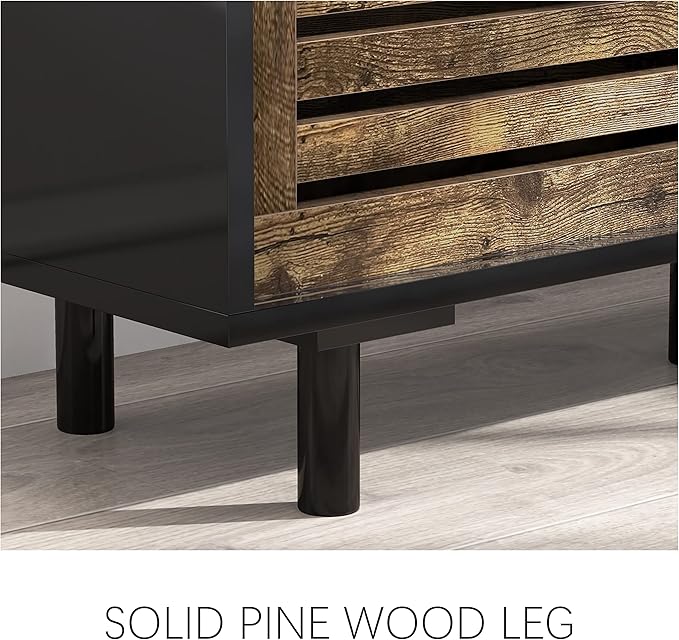 About This Mid-Century Modern: Smooth surface black TV stand with rustic brown slatted doors and large storage space. Charavector mid-century...