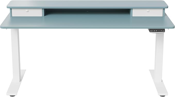 FEZIBO 60 x 24 Inch Height Adjustable Electric Standing Desk with Double Drawer, Stand Up Desk with Storage Shelf, Sit Stand Desk, Blue