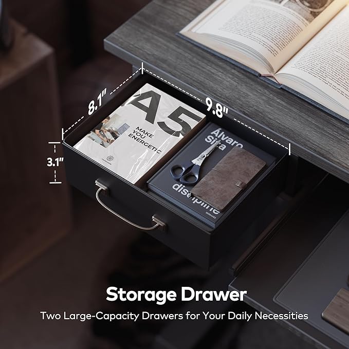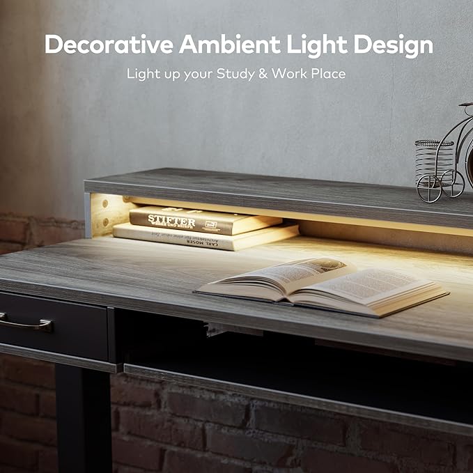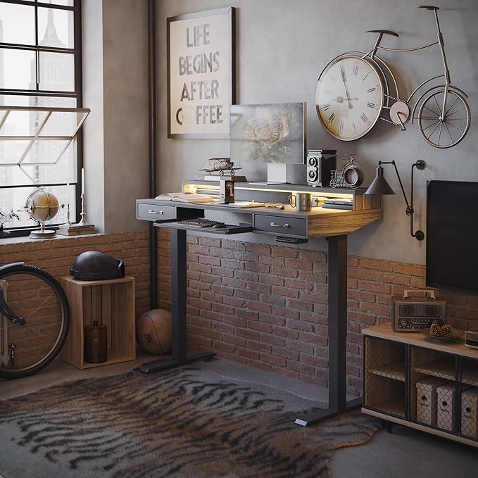 FEZIBO 48 x 24 Inch Height Adjustable Electric Standing Desk with Double Drawers&Keyboard Tray, Stand Up Desk with LED Strips, Sit Stand Desk with Monitor Stand, Rustic Grey