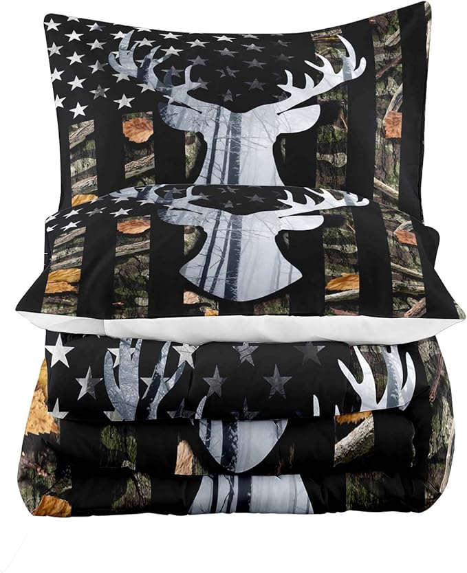 LUVIVIHOME 3PCS Deer Hunting Comforter Set King Size, Camo Bed Set Patriotic Black American Flag Bedding, Forest Animal Wildlife Country Lodge Rustic Farmhouse Cabin Camouflage Quilt, 2 Pillow Shams