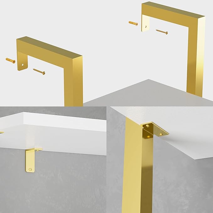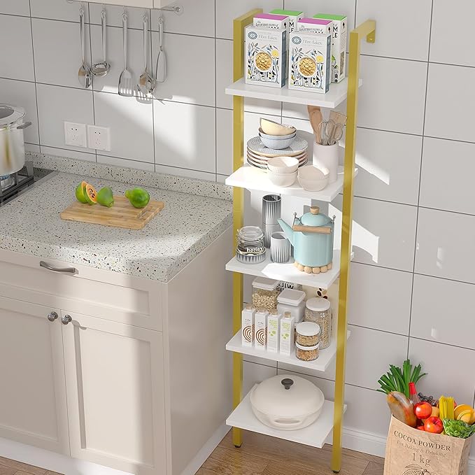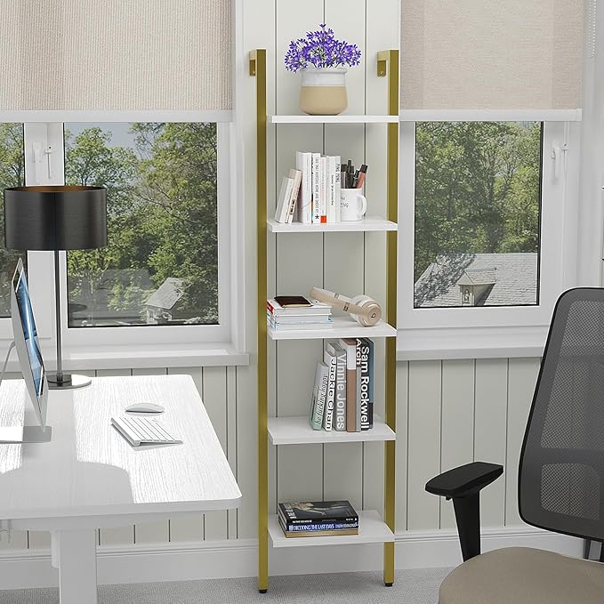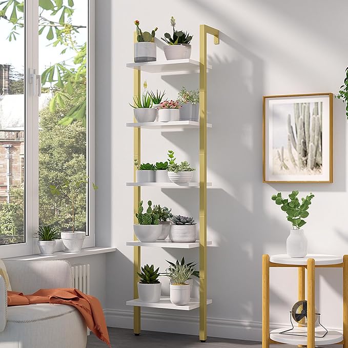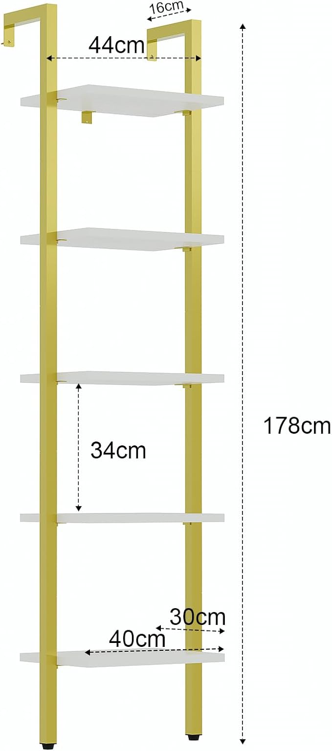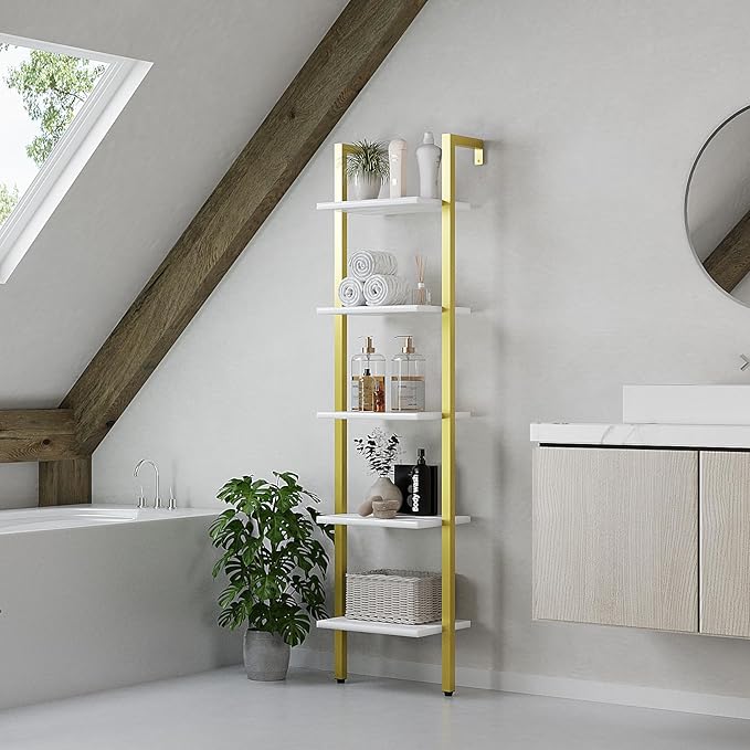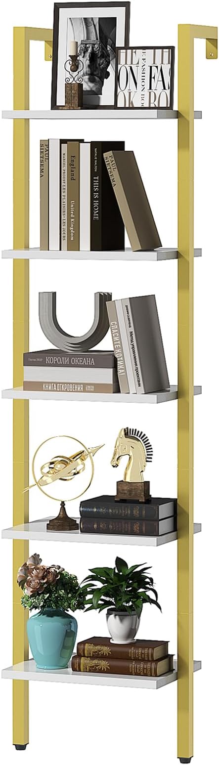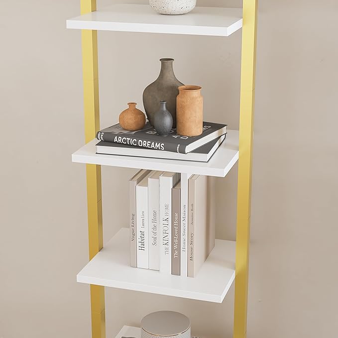 YMYNY 5 Tiers Ladder Bookcase, Industrial Wall Mounted Bookshelf, Open Display Rack with Metal Frame, Wooden Storage Shelves for Bedroom, Home Office, Living Room, White+Gold, 70*17.3*11.8"UHBC015W