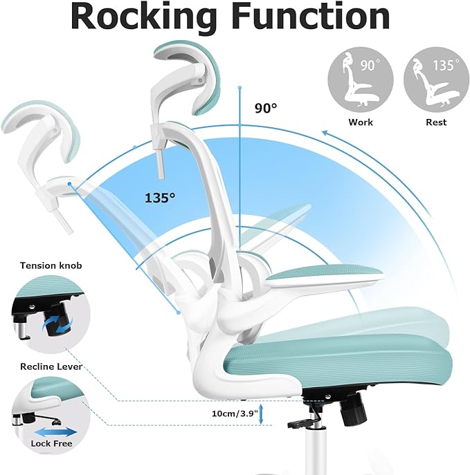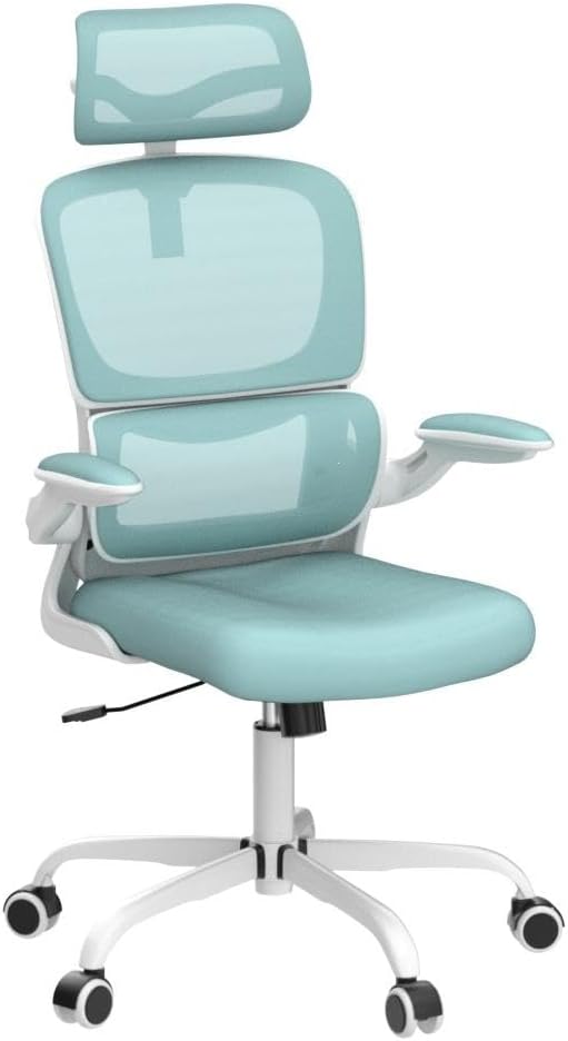 Ergonomic Office Chair, High Back Mesh Desk Chair with Lumbar Support and Adjustable Headrest, Computer Gaming Chair with Flip-up Armrests, Executive Swivel Chair for Home Office (MintGreen)
