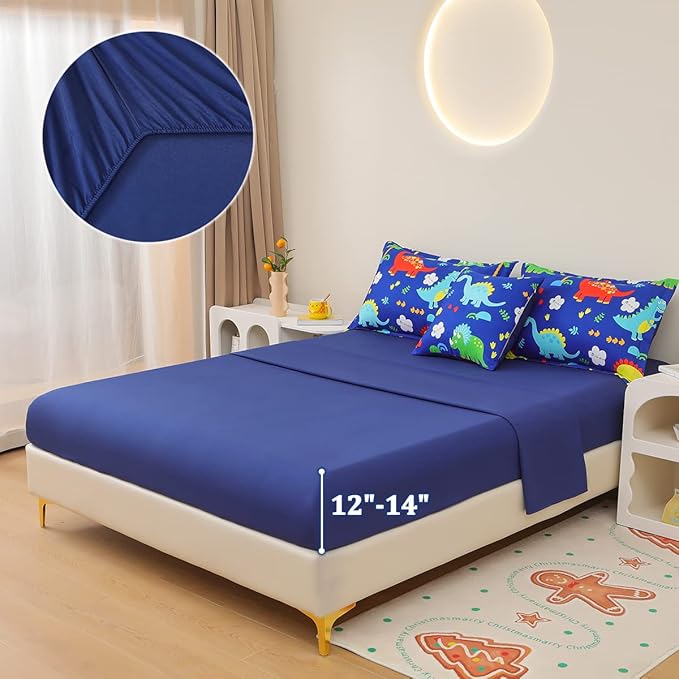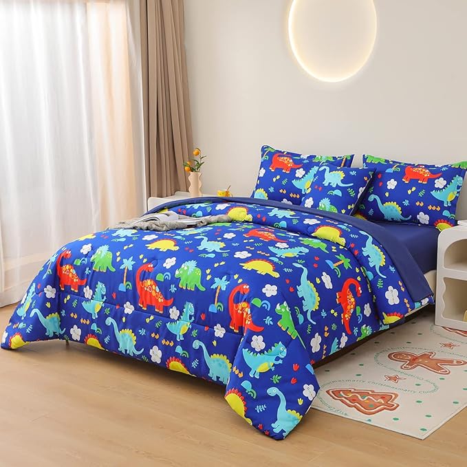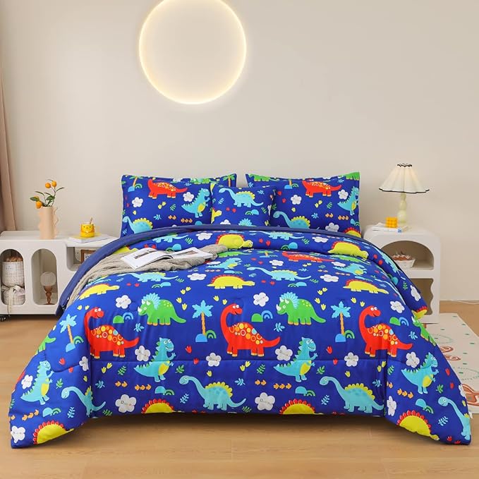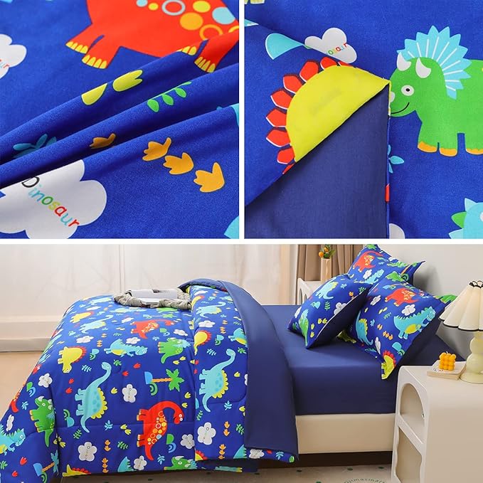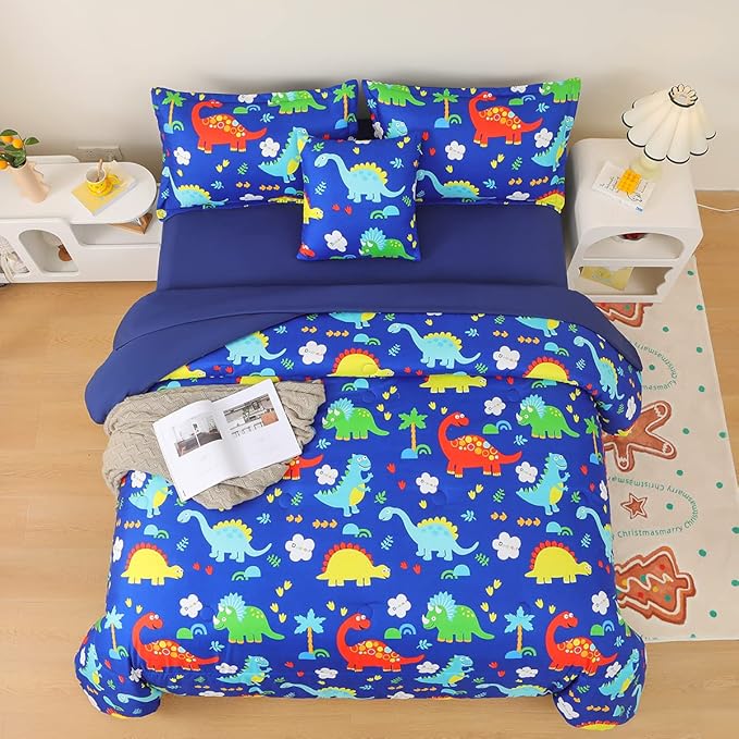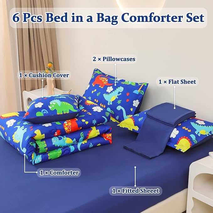 Dinosaur Comforter Set for Boys, 6 Pcs Bed in a Bag Twin Blue Dinosaur Wild Park Jungle Print Kids Bedding Set with Sheets
