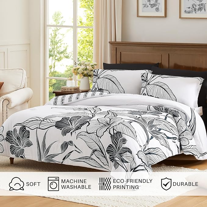 WRENSONGE Queen Comforter Set, 7 Pieces Black and White Floral Comforter Set with Sheets for Queen Size Bed, Flower Pattern Queen Bedding Set, Soft Lightweight Breathable Bed in a Bag for All Seasons