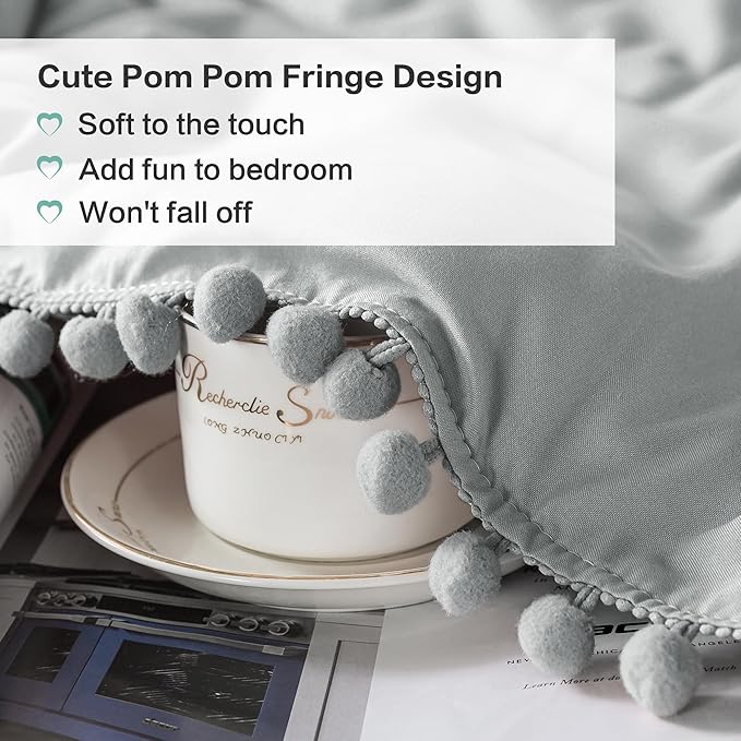 Litanika Queen Size Comforter Set Light Grey,3 Pieces Light Grey Boho Pom Pom Lightweight Bed Comforter, All Season Soft Solid Color Bedding Comforter Sets (1 Comforter 90x90 Inch, 2 Pillowcases)