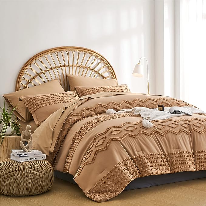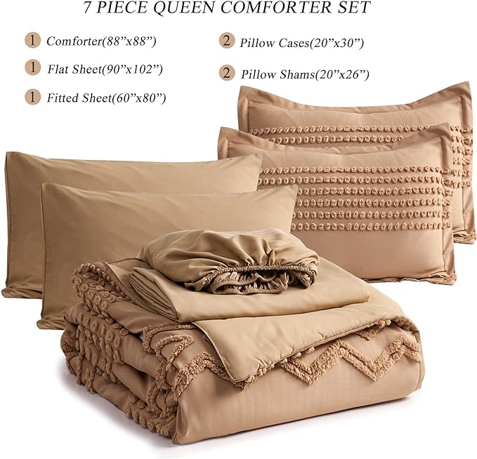 KAKIJUMN Khaki Tufted Comforter Set Queen Size 7 Piece Bed in a Bag, Shabby Chic Boho Comforter and Sheet Set, All Season Soft Microfiber Complete Bedding Set(Khaki,Queen)