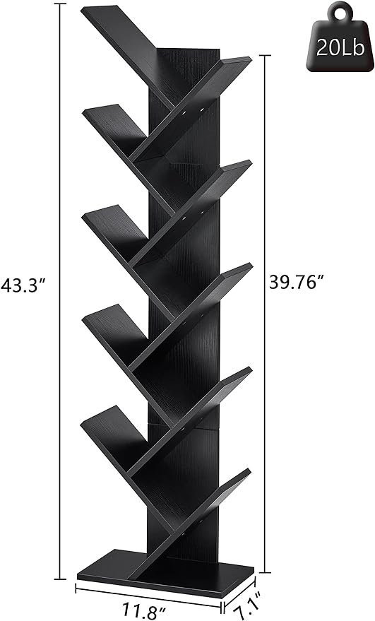 Hoctieon 10 Tier Tree Bookshelf, 10 Shelf Bookcase, Free Standing Tree Bookcase, Display Floor Standing Shelf for Books, Book Organizer Shelves for Home Office, Living Room, Bedroom, Black