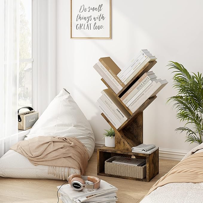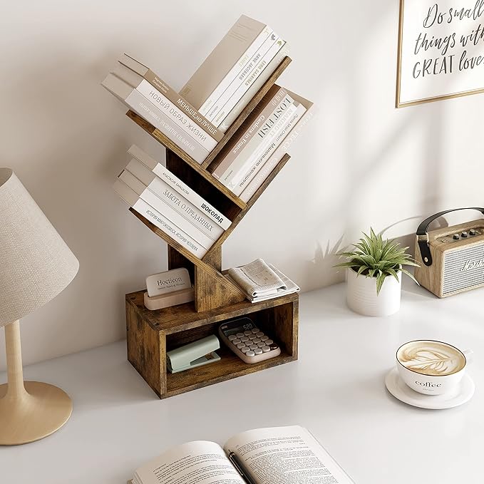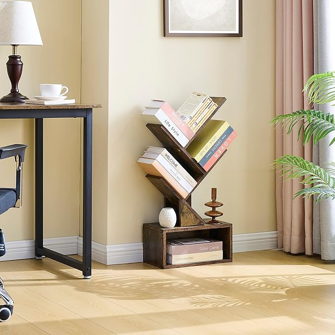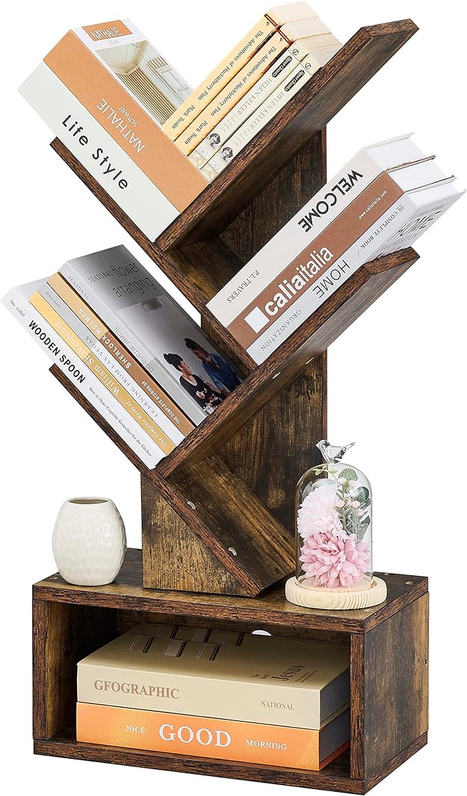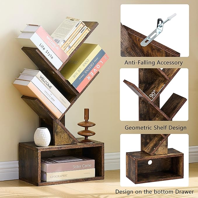 Hoctieon 3 Tier Tree Bookshelf, Small Bookcase with Drawer, Desktop Book Shelf, Display Floor Standing Storage Shelf, Book Organizer Shelves for Home Office, Rustic Brown