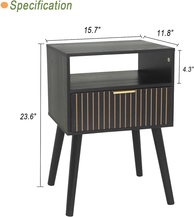 MaxSmeo Black Nightstand with Drawer, Mid Century Modern Bedside Table with Open Shelf Storage, End Table with Solid Wood Legs, Black