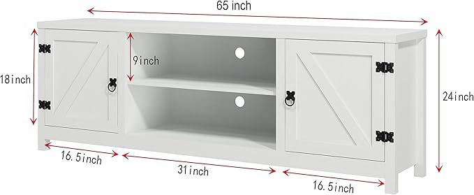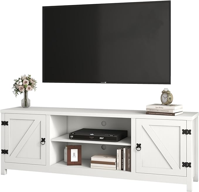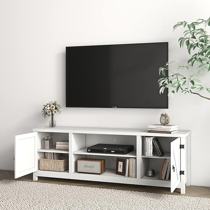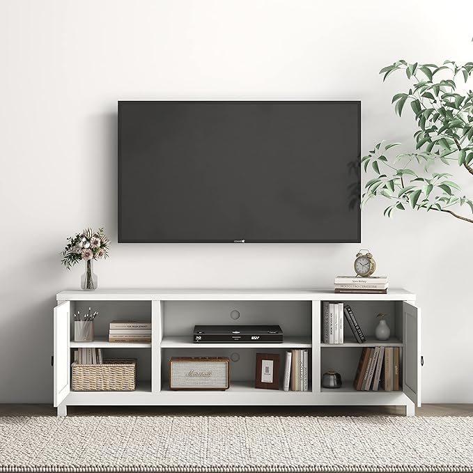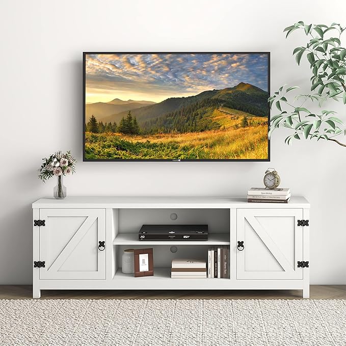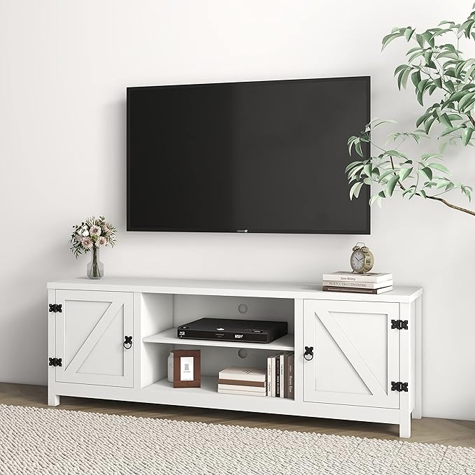 Panana Modern Farmhouse TV Stand, Entertainment Center for 70 inch TV with 2 Doors and Open Shelves for Living Room, Bedroom (White, 65 inch)