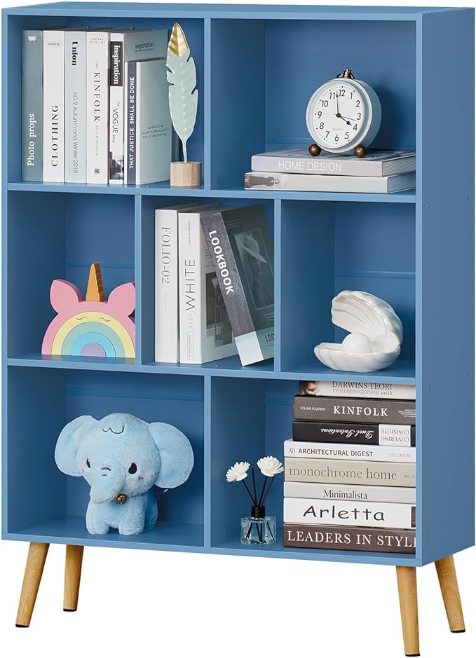 YAHARBO 7 Cube Bookshelf, Blue Kids Book Shelf with Cubby Storage,Wooden Modern Bookcase with Legs,3 Tier Freestanding Display Book Case,Children Toy Organizer,Bookshelves for Office,Nursery,Playroom