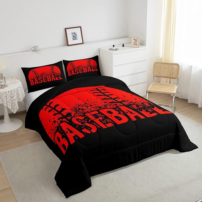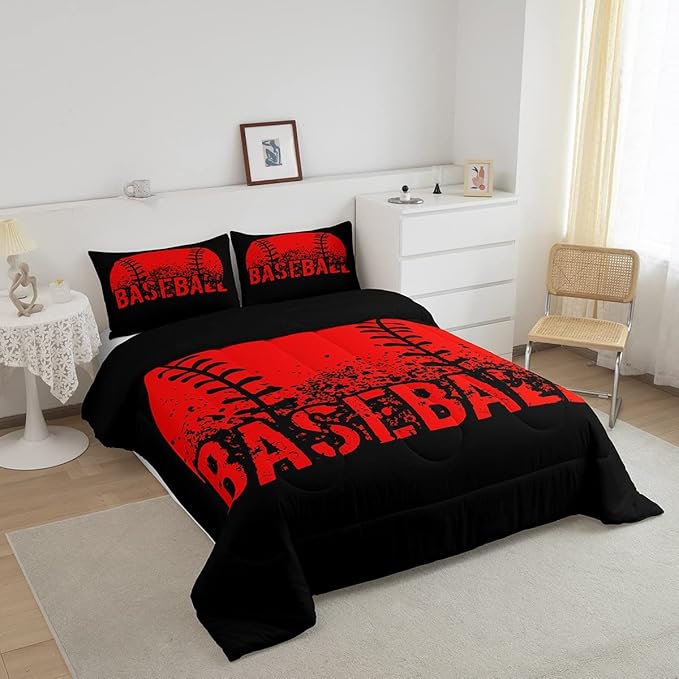 Baseball Comforter Set Queen Size Kids Red Black Sports Quilt Bedding Set For Boys Girls,Reversible Black Bedding Comforter Sets Soft Lightweight For All Season,1 Comforter And 2 Pillow Cases