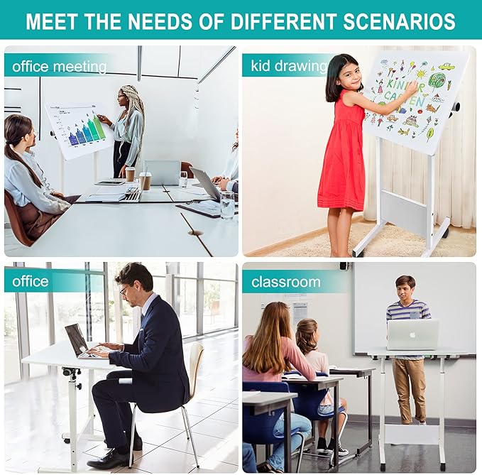 Adjustable Height Standing Desk, Writable Tempered Glass Desktop with Eraser, 360° Flip, Wheels – Ideal for Small Spaces and Home Offices, 31 in, White(Adjustable Height: 32-47 in)