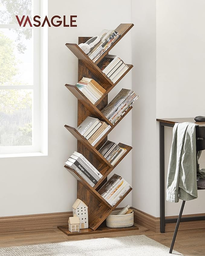 VASAGLE Bookshelf, Tree-Shaped Bookcase with 13 Storage Shelves, Rounded Corners & 9-Tier Floor Standing Tree Bookshelf, with Shelves for Living Room, Home Office, Rustic Brown ULBC11BX