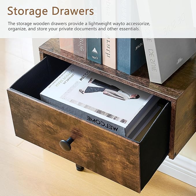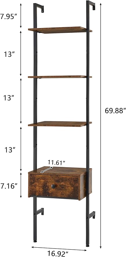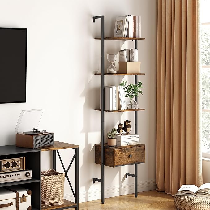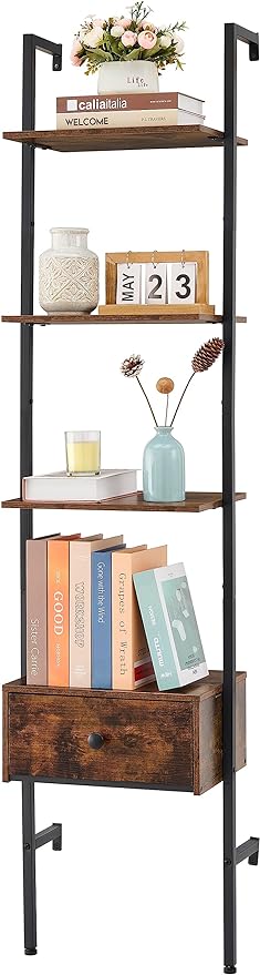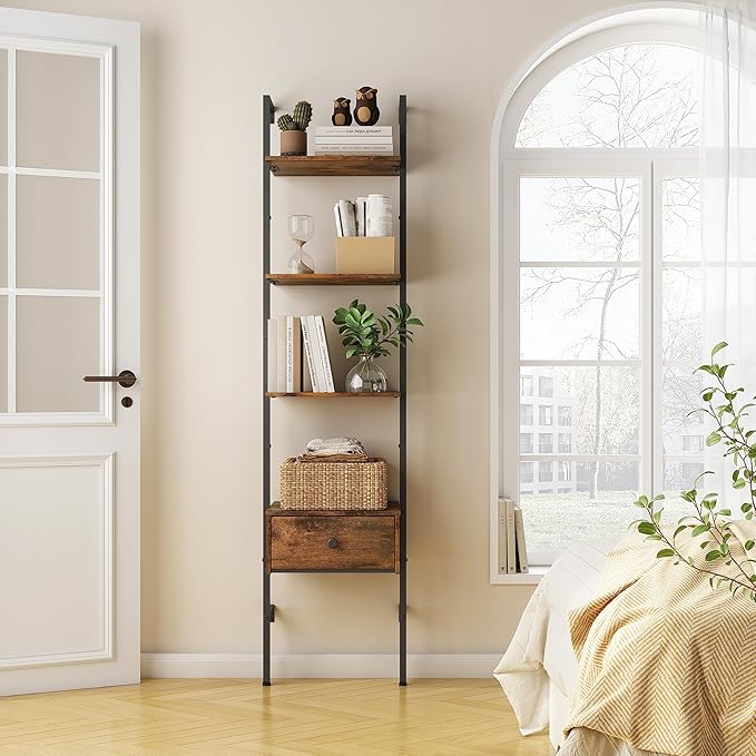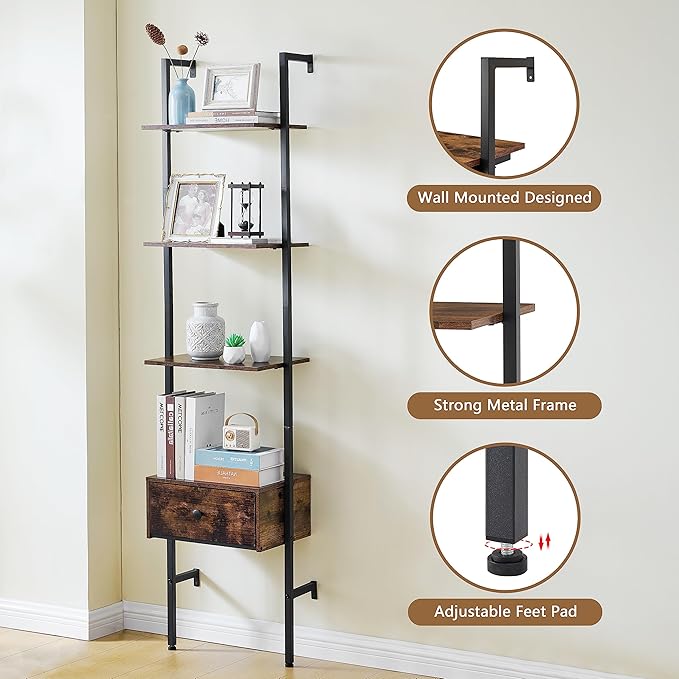 Tajsoon Ladder Shelf, Tall Bookcase with Storage Drawers, 4-Tier Wood Wall Mounted Bookshelf, Open Display Rack, Storage Shelves for Bedroom, Home Office, Collection, Plant Flower, Rustic Brown