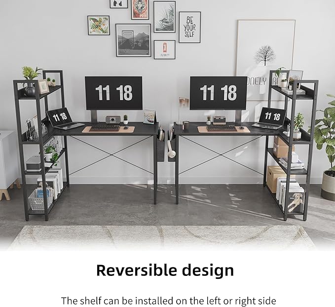 Treesland 55 Inch Computer Desk with Storage Shelves, L Shaped Desk with Storage, Corner Desk with Storage, Home Office Desks, Bookshelf Desk, Writing Study Desk for Bedroom, Black