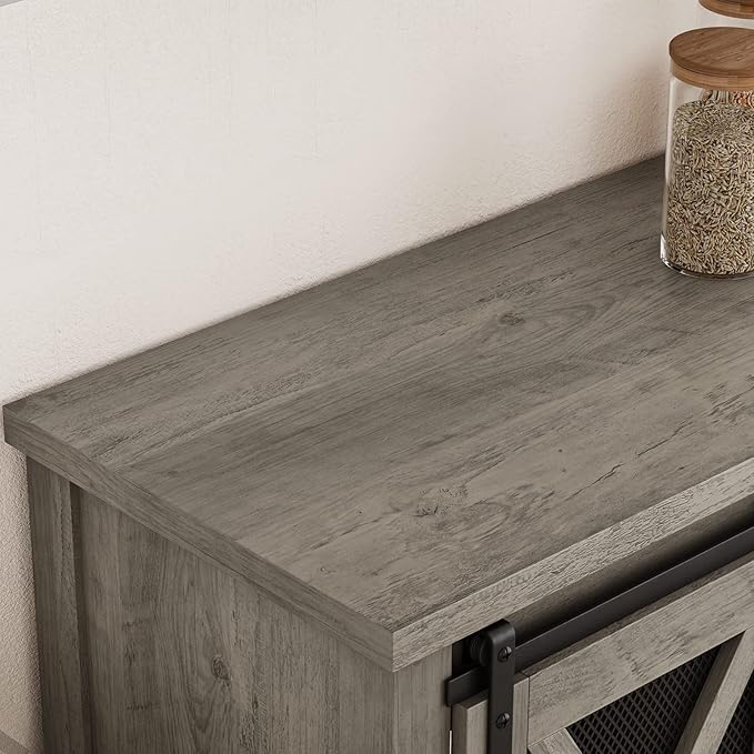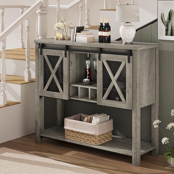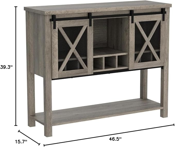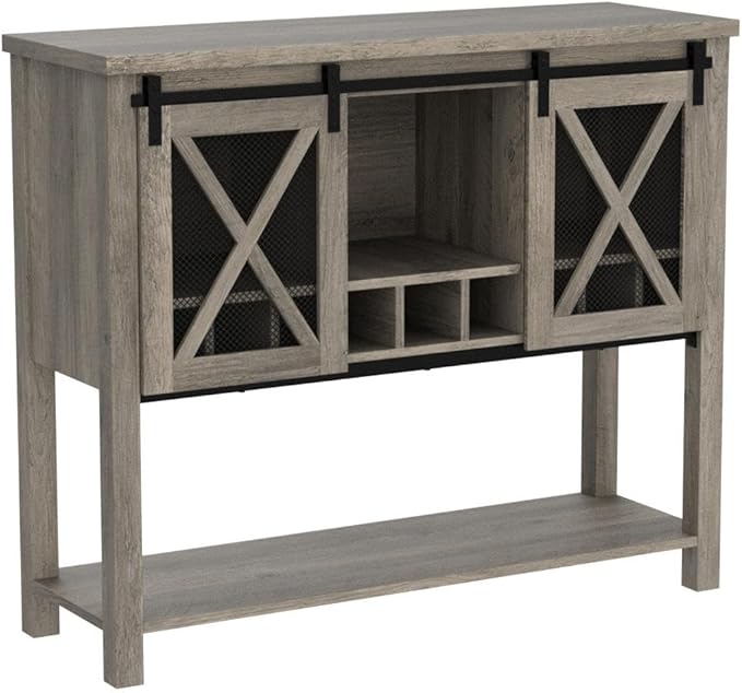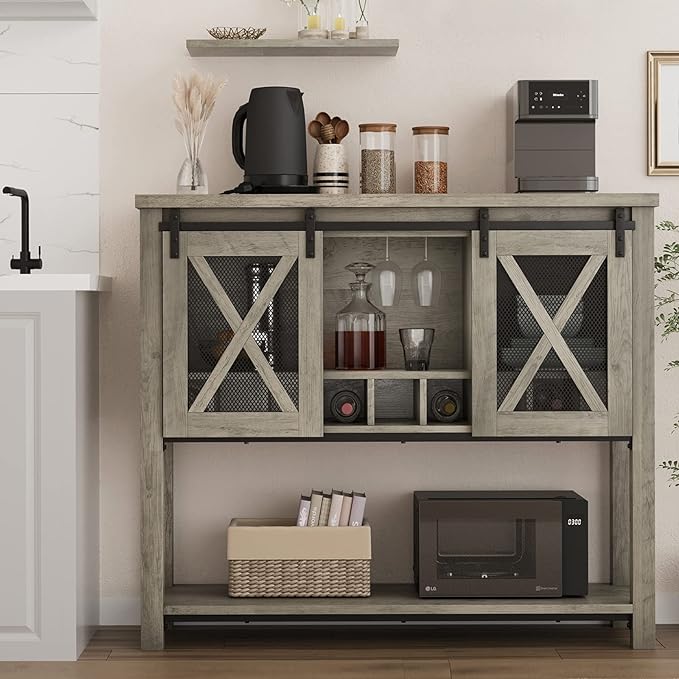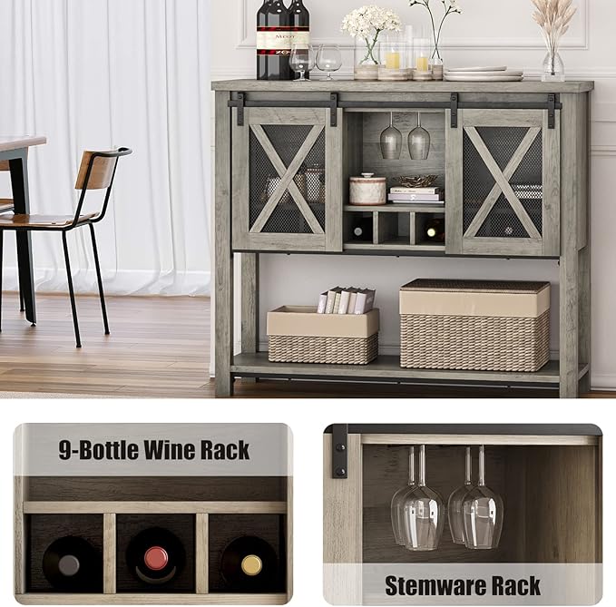 IDEALHOUSE Buffet Storage Cabinet Farmhouse Wine Cabinet Coffee Bar Table with Wine Glass Rack and Storage, Wood Buffets and Sideboards with Barn Mesh Door for Kitchen, Dining, Living Room