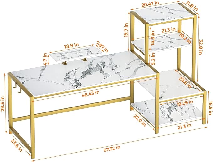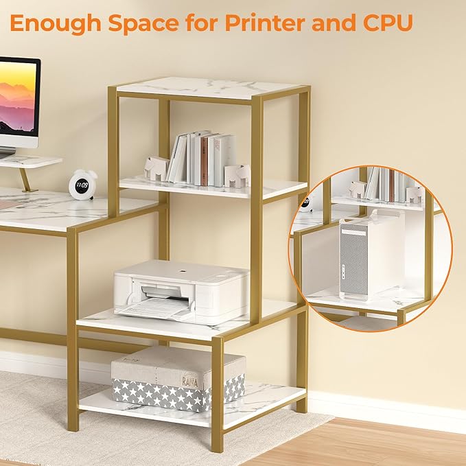 GreenForest Computer Desk with Storage Printer Shelf, 67 inch Home Office Vanity Desk with Movable Monitor Stand and 2 Headphone Hook for PC Makeup Writing Study, White and Golden