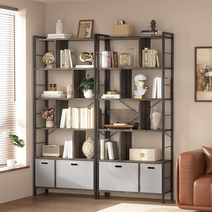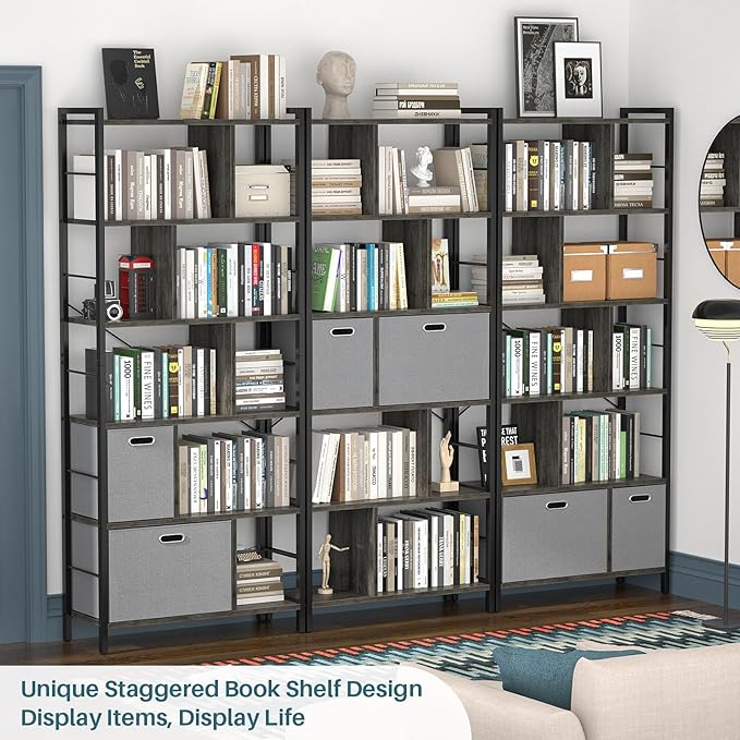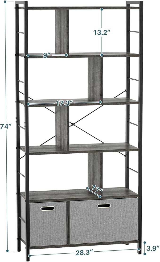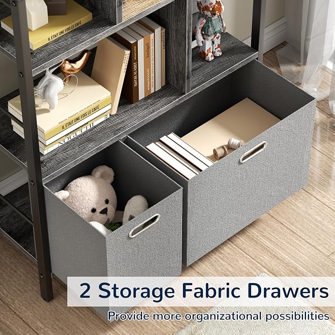 armocity 74 Inch Tall Bookshelf, 6 Tier Bookcase with Drawers, Modern Book Shelf Display Standing Shelf Units with Storage, Wood and Metal Bookshelves for Living Room, Bedroom, Home Office, Grey Oak