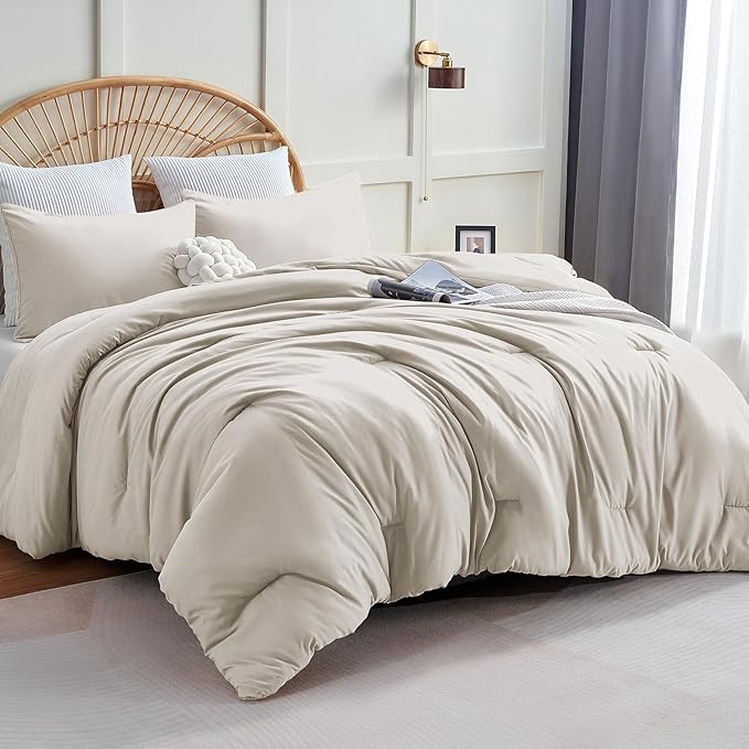 CozyLux Beige Comforter Set King Size, 3 Pieces Boho Solid Breathable Quilted Style Bedding Sets, Luxury Fluffy Soft Microfiber Comforter for All Season(1 Comforter & 2 Pillowcases)