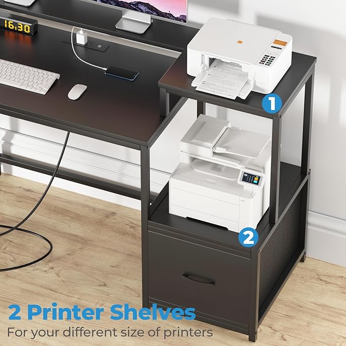 GreenForest 69 inch L Shaped Computer Desk with Drawers and Printer Stand, Gaming Desk with Power Outlet, Monitor Shelf, Storage Shelves and Hooks for Home Office Working, Writing, Studying, Black